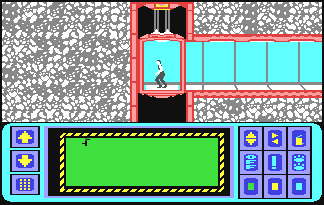 In the elevator: push the joystick forward or back to go up or down. Push the joystick left or right to move in either direction along the corridor. Running to the edge of the screen takes you into a room. (this is the place where you start in the beginning) also-> this is where you use your buttons to view your status or use equipment which will be explained later on.
