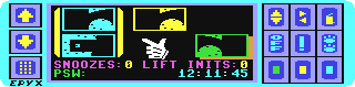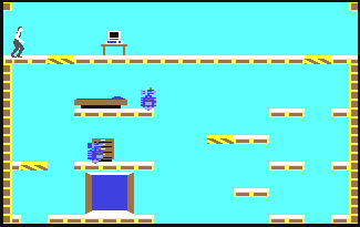 In the elevator: push the joystick forward or back to go up or down. Push the joystick left or right to move in either direction along the corridor. Running to the edge of the screen takes you into a room. (this is the place where you start in the beginning) also-> this is where you use your buttons to view your status or use equipment which will be explained later on.