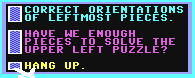 - memory window - (mid upper left) - displays two pieces of the puzzle your working with - (arrow command moves up a piece or down a piece to add to the puzzle)
