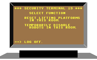 To use a security terminal, move directly in front of it and push the joystick forward. The screen of the security terminal will enlarge to fill your display. You can select one of three functions with the joystick (press button when the arrow points to the function you want):